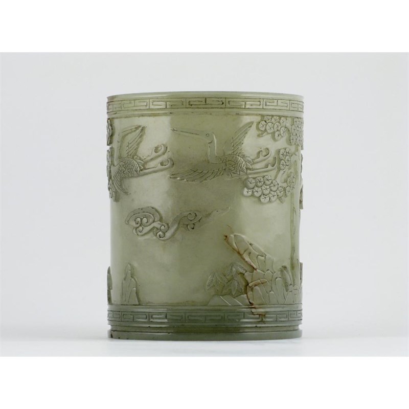 **A Chinese jade cylindrical brush pot, the body carved in relief with two prancing deer and two cranes in flight, divided by flowering trees between key fret bands, 12.1cm.