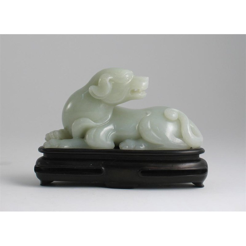 A Chinese pale celadon jade carving of a recumbent hound, its neck twisted and looking back, raised on a wood stand, 14cm. (2)