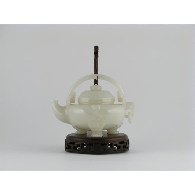 **A large Chinese white jade pouring vessel, with a double-hinged handle, and a single loose suspension ring, the shoulders carved with two horned goats heads, the three paw feet capped with lion dog masks, probably 19th century, 20.5cm, and a wood stand. (3)