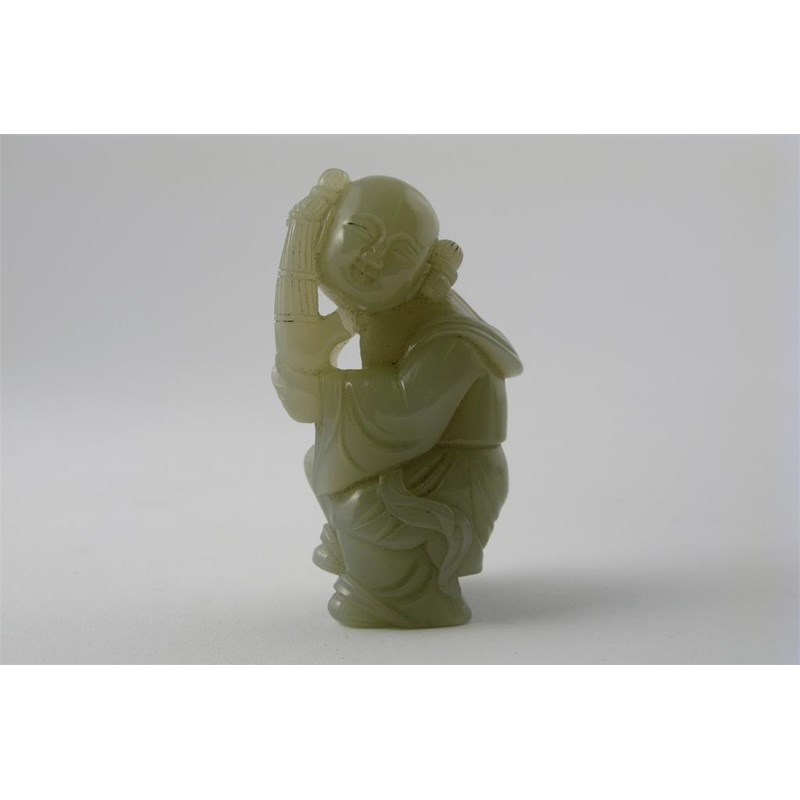 A Chinese pale celadon jade carving of a boy, dancing and wearing flowing robes, 6.5cm.