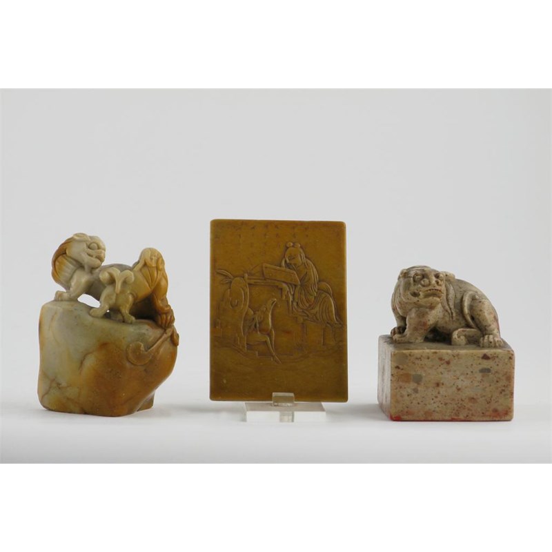 Two Chinese soapstone seals, one square-section with a rampant lion dog, the other seal with two lion dogs and eight incised characters, and a Chinese rectangular soapstone plaque carved with a seated sage reading to a deer, all 19th century, 8.4cm max. (3)