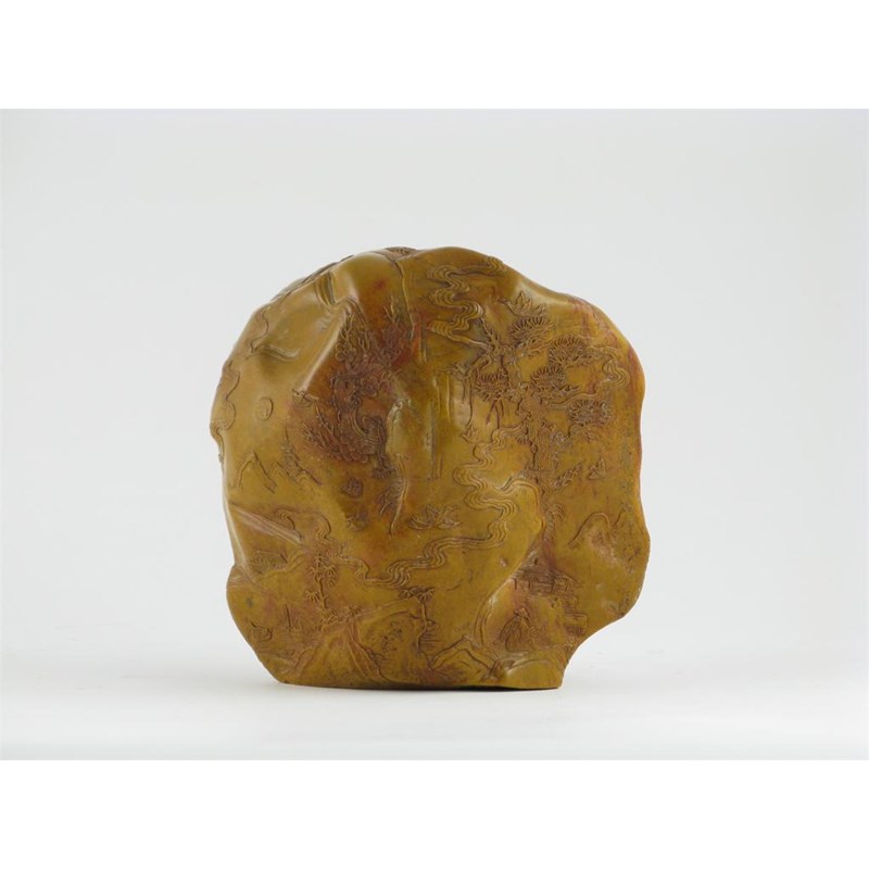 A large Chinese soapstone seal, formed as a boulder, carved in detail around the stone's natural shape, with two figures, huts, gnarled trees growing off cliff faces, many birds in flight and a long and swirling cloud of smoke, 19th century, 14.5cm.