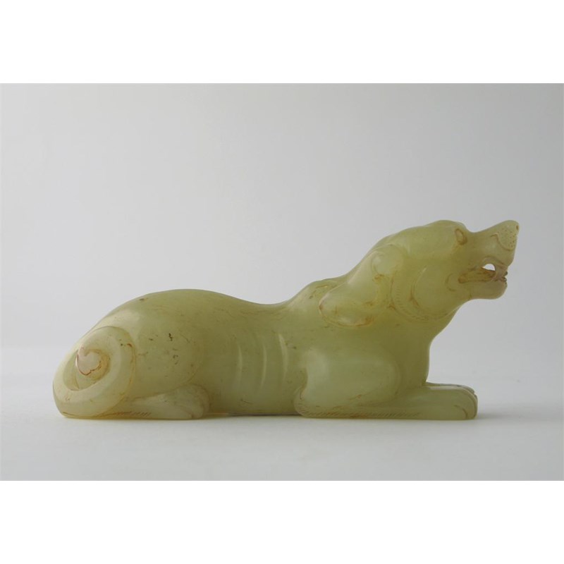 **A Chinese yellow jade carving of a recumbent hound, its head raised baring its teeth, probably 17th century, 12.5cm.