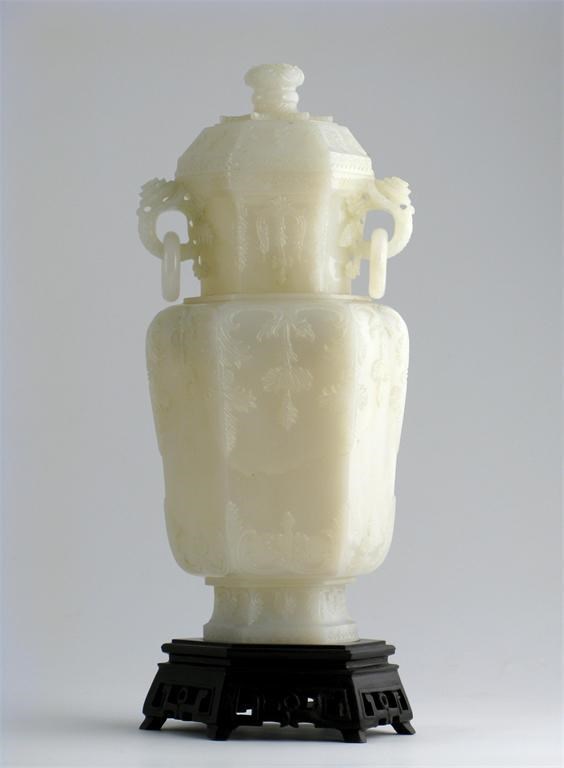 **An impressive white jade Mughal hexagonal vase and cover, finely carved with suspended foliate motifs, the elaborate handles as flower heads, the hollow knop forming a star shape and surrounded by six thick leaves, probably 19th century, raised on a hardwood stand, 25.5cm. (3)