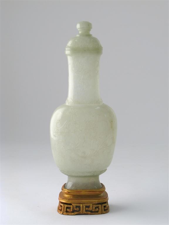 **A Mughal translucent jade vase and cover, the body exquisitely carved with lotus flowers, a band of ruyi around the neck and cover, probably 18th century, 19.5cm, raised on a gilt wood stand. (2)