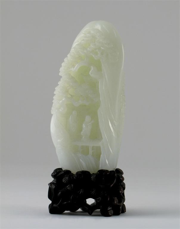 **A good Chinese white jade boulder carving, the tall limestone outcrop depicting figures and pagodas beneath pine trees growing from crevasses, 10cm, raised on a modern stand.