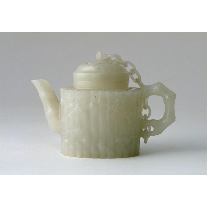 **A Chinese white jade teapot and cover, carved to simulate bamboo, the lid joined to the handle by a fine chain, 20th century, 11cm.