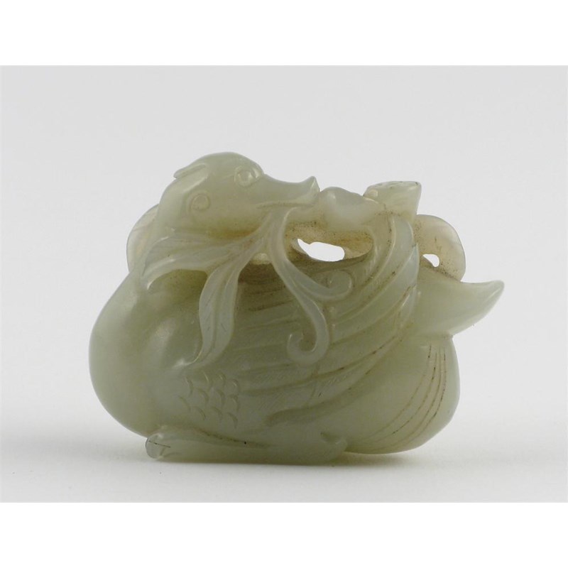 A Chinese celadon jade duck, turning his head round, holding a lotus pod and leaf in its beak, 19th/20th century, 5cm.