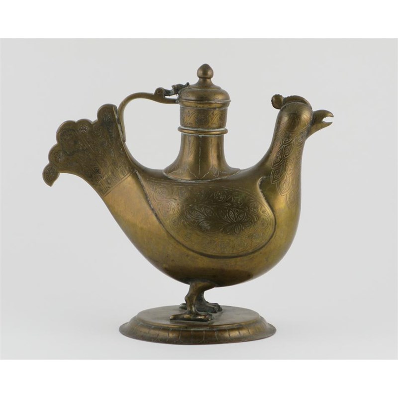 An Islamic brass ewer, modelled as a cockerel, incised with floral patterns, with a hinged lid and raised on a round base, 19th century, 24cm. Find inscription on base??