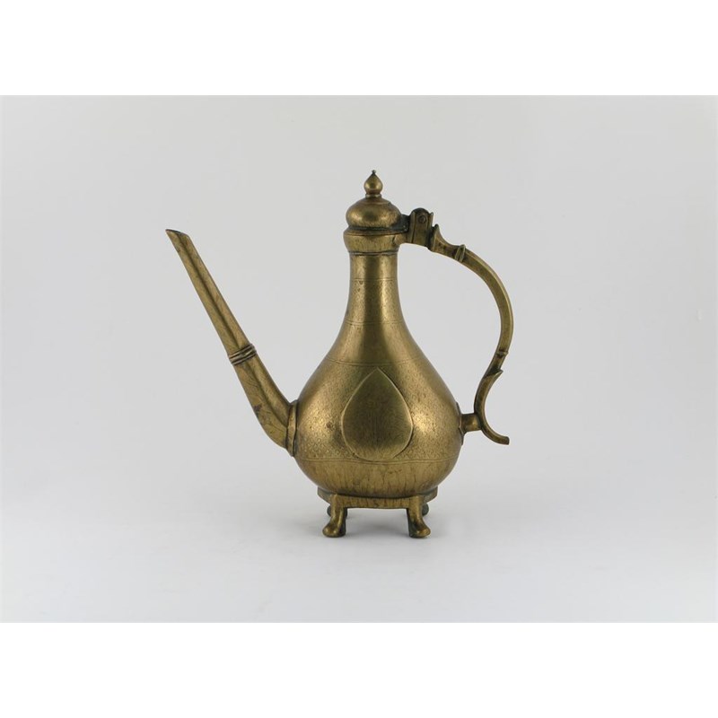 A Persian bronze ewer, the pear-shaped body lightly engraved with geometric designs, standing on four feet, with a hexagonal spout, 18th /19th century, 29.5cm.