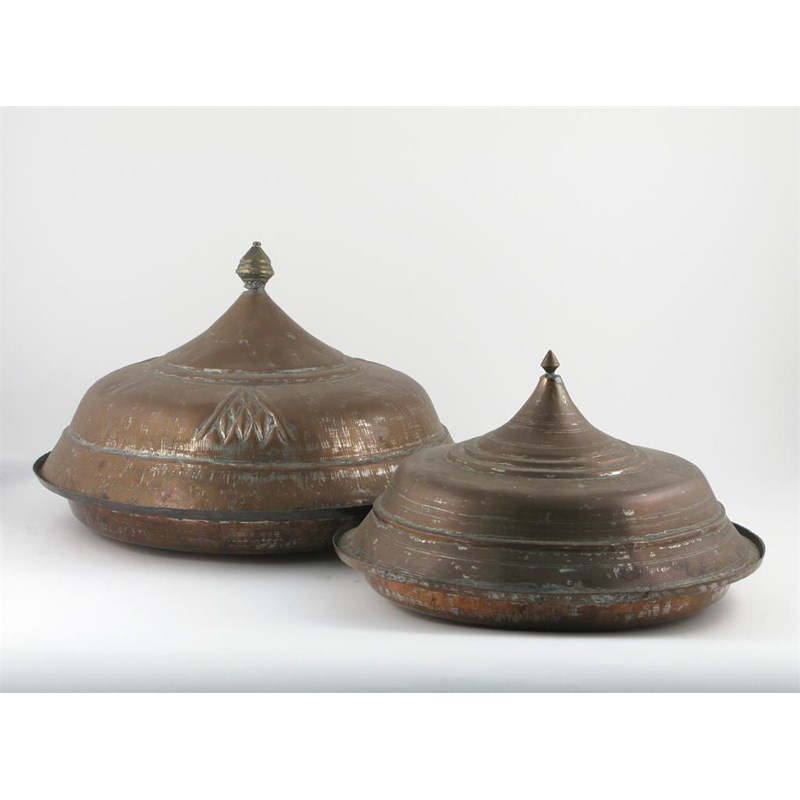 Two large Turkish copper dishes and covers, the larger one hammered with three geometric motifs, the smaller bearing two inscriptions on the lid with a date for 1845 and an encircled Turkish inscription to the base, late Ottoman, dented and the larger dish's finial loose, 39cm max. (4)