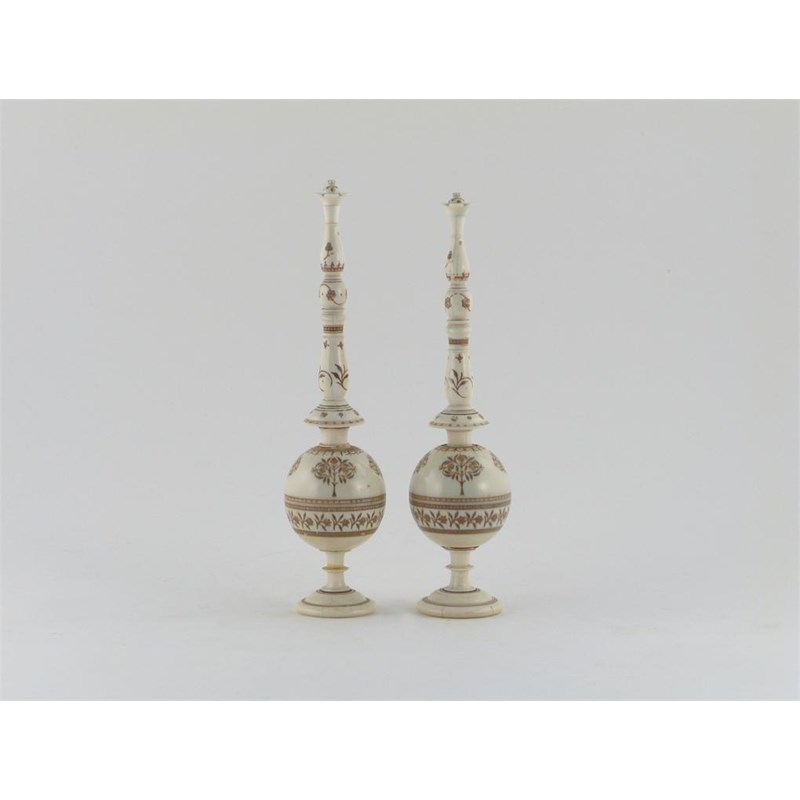 A pair of Indian ivory rosewater sprinklers, turned in sections and engraved with formal floral motifs, 19th century, 21cm. (2)