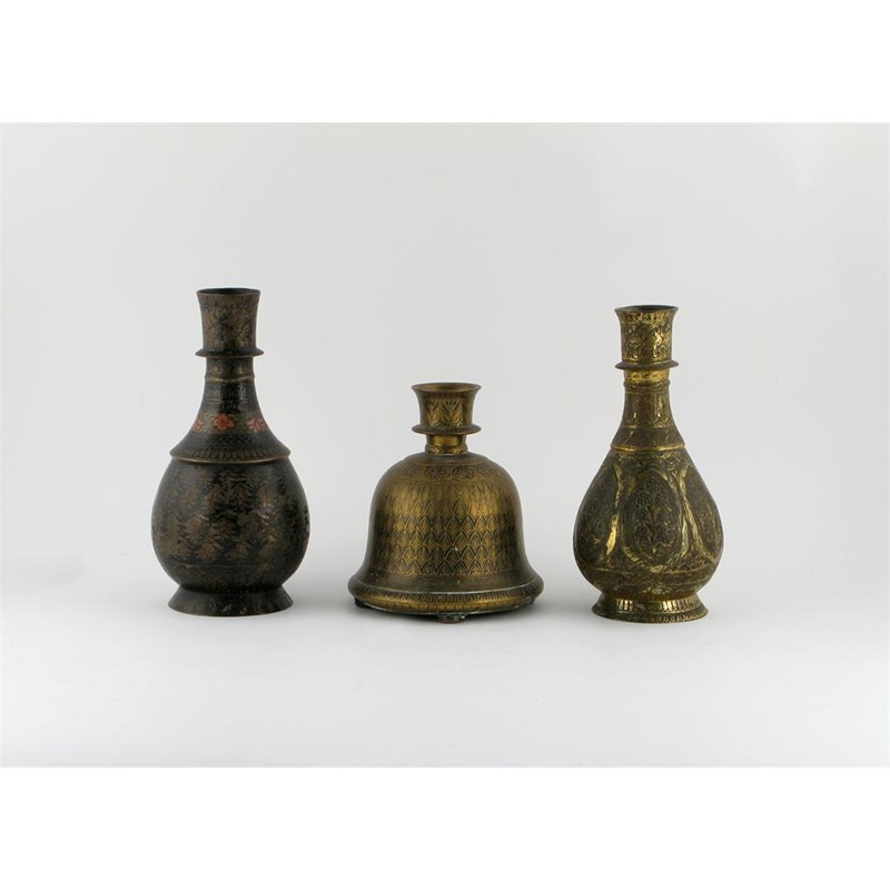 Two Middle Eastern brass bottles, and a hookah base, all decorated with stylized flowers and geometric motifs, 19th century, some damages, 22.5cm max. (3)