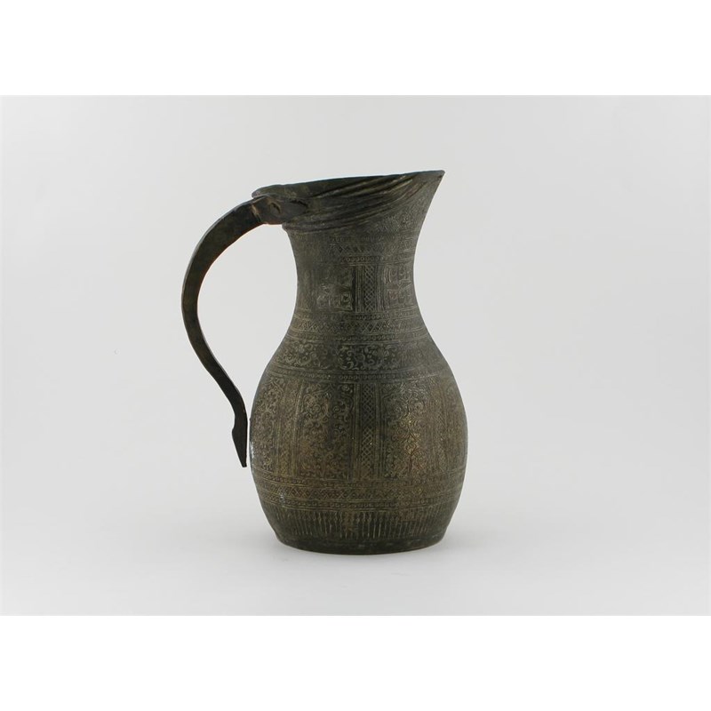 A Persian silvered copper jug, incised with floral panels, perhaps 17th century, rim reduced, 31cm.