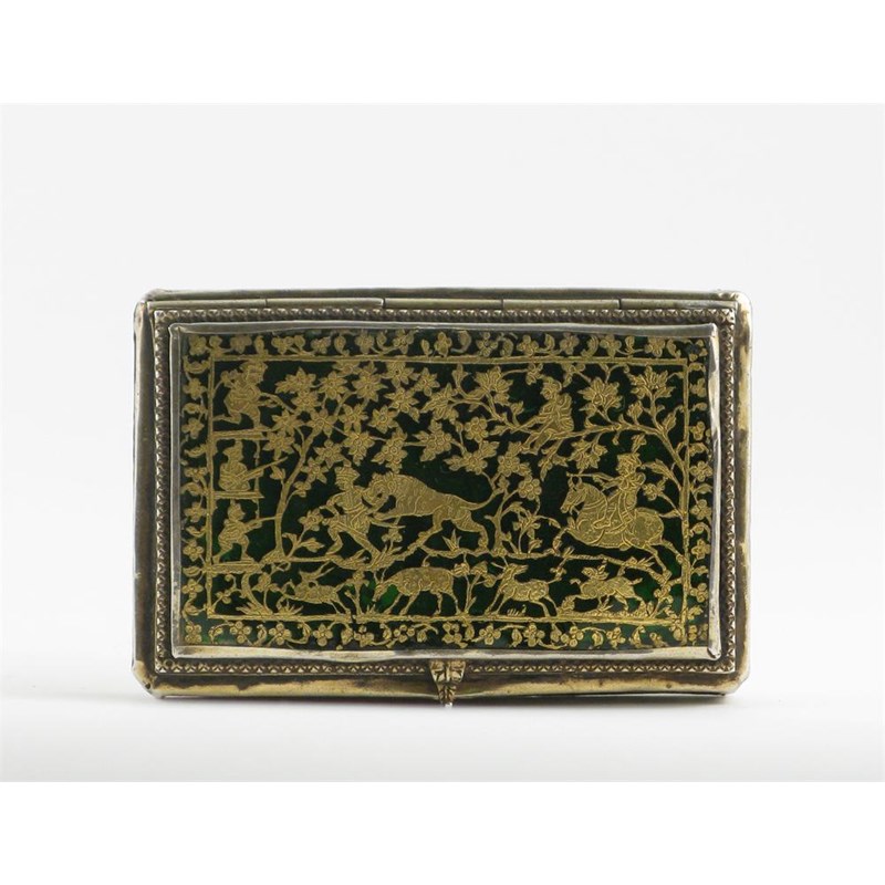 An Indian silver-gilt rectangular box, the hinged lid finely decorated in gold with an intricate hunting scene, including six figures, four beasts and a tiger amidst naturalistic flowers on a green foil-backed ground, 19th century, minor damages, 9cm.