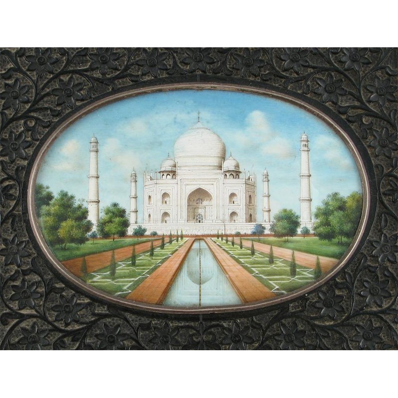 Three Indian miniature paintings on ivory, two of the Taj Mahal, the third of an interior scene, two with carved wood frames, 19th/20th century, 22.5cm max. (3)