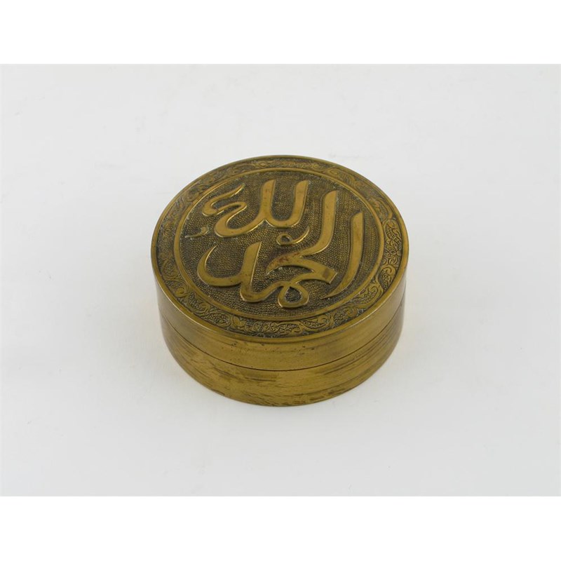 A Chinese gilt bronze circular box and cover, made for the Islamic market, the top with the Arabic inscription 'Alhamduli Allah' meaning 'Praise God', within a scrolling foliate border, 17th century, 10.5cm. (2) Provevance: By repute, the 1st Baron Amherst of Hackney, of Didlington Hall. Cf. Christie's South Kensington, 14th February 2002, lot 95 for a similar example.