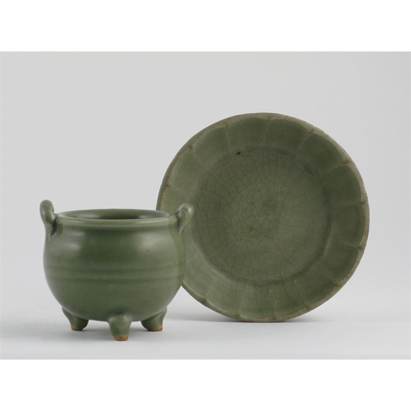 A Chinese celadon moulded brush washer, and a small globular tripod censer with rope twist ring handles, 12th century and later, 11.5 cm. (2)