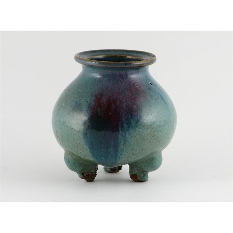 A Chinese Junyao tripod censer, decorated with large purple splashes, glaze chips to the feet, 12.5cm.