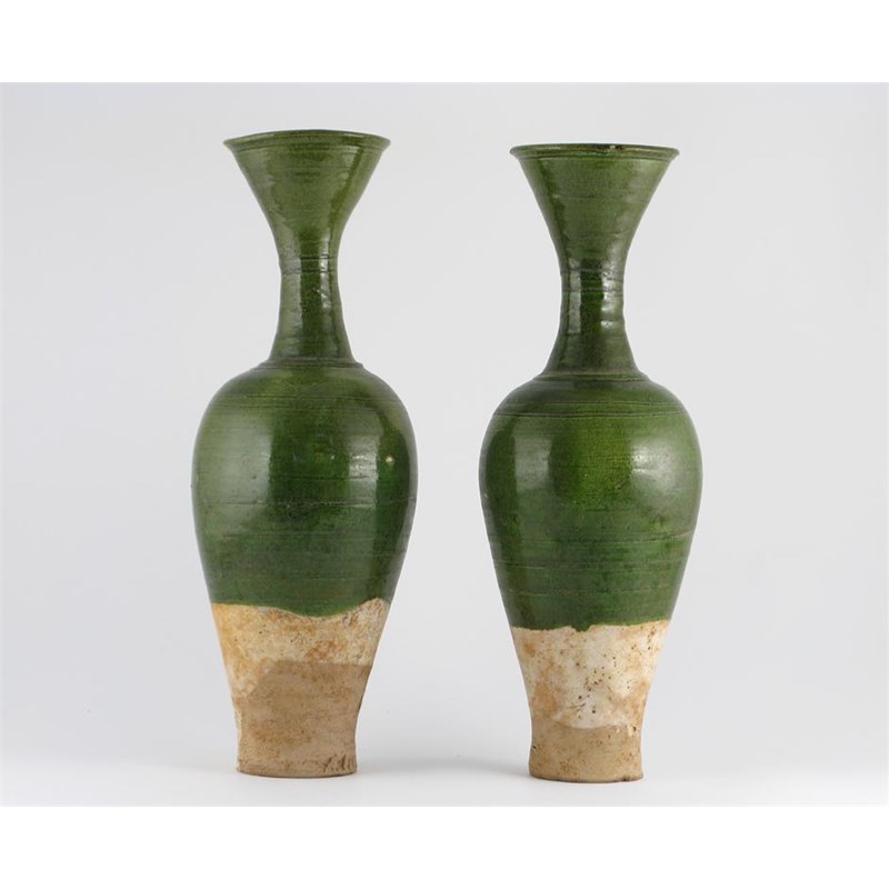 A pair of Chinese ovoid pottery vases, with flared slender necks, with a green glaze falling short of the foot, Liao dynasty 907-1125 AD, 35.5cm. (2)