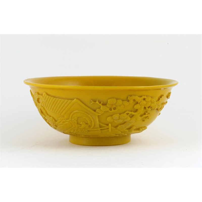 **A Chinese large yellow Beijing glass bowl, the exterior carved in relief with a sage and his attendant in a mountainous landscape, 18th/19th century, some restoration, 23cm.
