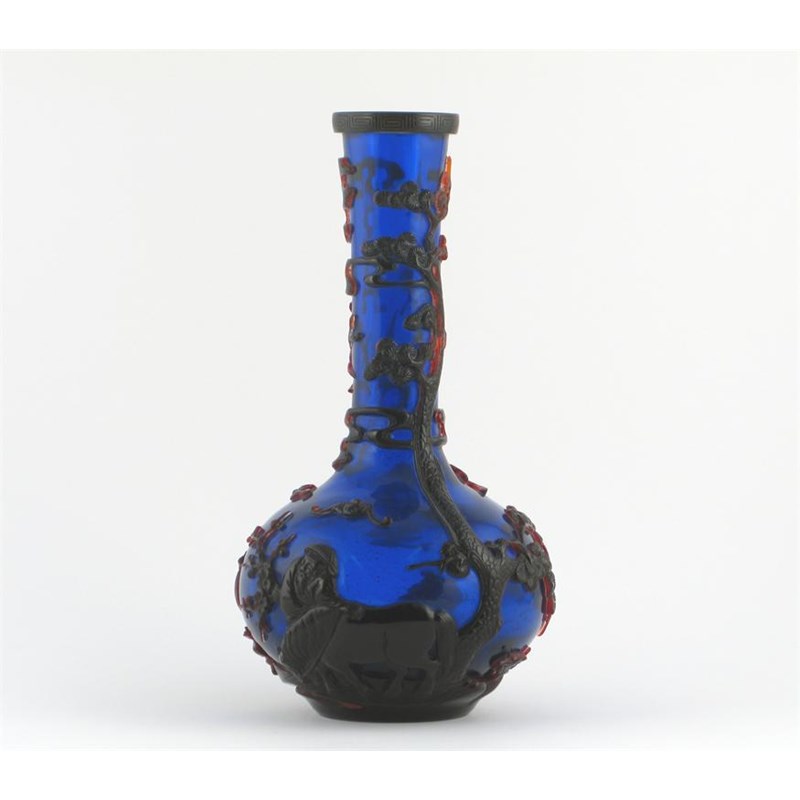 A Chinese Beijing blue glass bottle vase, overlaid in red with four figures and a horse beneath a pine tree, bats and a crane, the base with a four character Qianlong mark but later, 26.5cm.