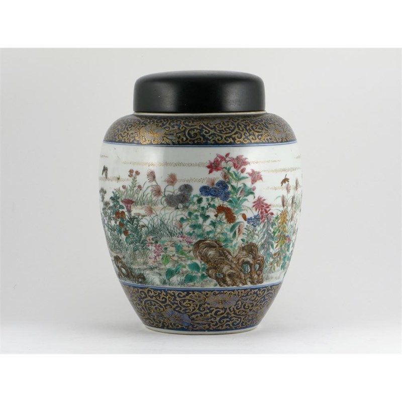 A Japanese famille rose ovoid vase, with a turned wood cover, the body painted with butterflies amidst a multitude of flowers, c.1900, 30cm. (2)