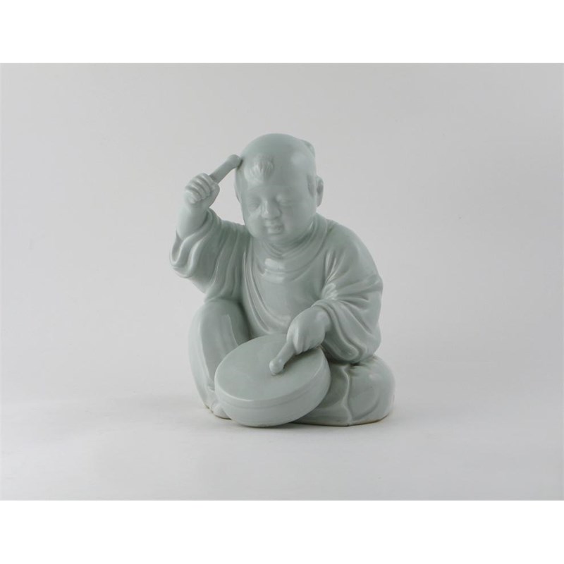 A Japanese white-glazed porcelain model of a boy, beating a drum, which rests upon his knee, c.1900, 23cm.