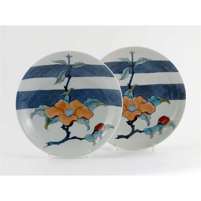 A pair of Nabeshima saucer dishes, painted with flowering branches on a banded wave ground, 19th/20th century, 20.5cm. (2)