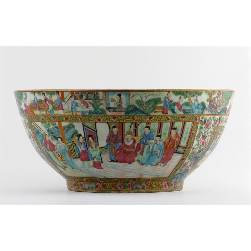 A Chinese Canton famille rose bowl, brightly decorated with figures and animals in various pursuits, mid 19th century, broken and riveted, 32.5cm.