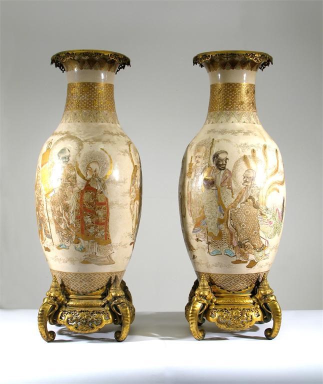 A large pair of Japanese Satsuma ovoid vases, with elaborate gilt metal mounts to the rims, the feet formed as elephant heads, the bodies decorated with immortals engaged in heavenly pursuits, Meiji 1868-1912, 87cm. (2)