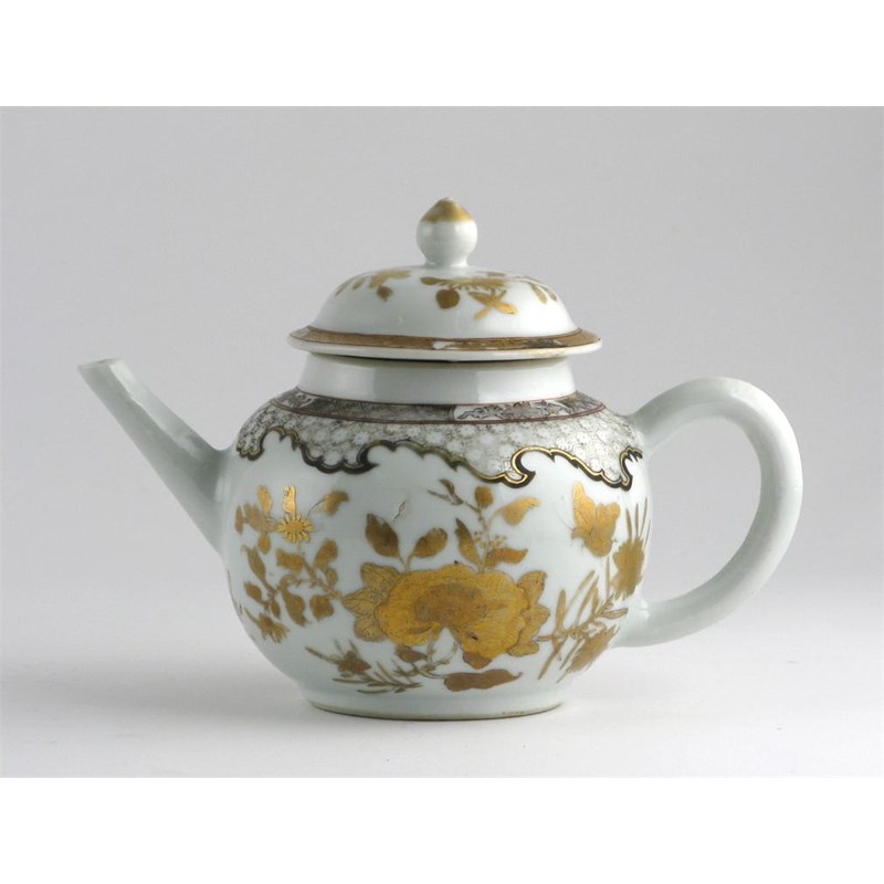 A Chinese teapot, painted in gold with peony and butterflies, the rim with a stylized wave motif, painted en grisaille with geometric motifs and panels of flowers, some rubbing to the gilt, a 1cm firing fault to the rim, and some nibbles to the lid and knop, 19th century. (2)