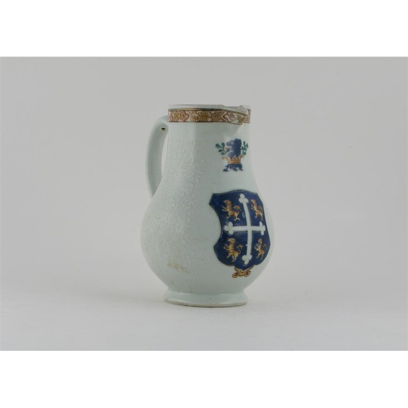 A Chinese armorial jug, decorated with a large blue shield, beneath a lion's head, between bianco sopra bianco floral panels, 18th century, some restoration to the spout, 18cm.