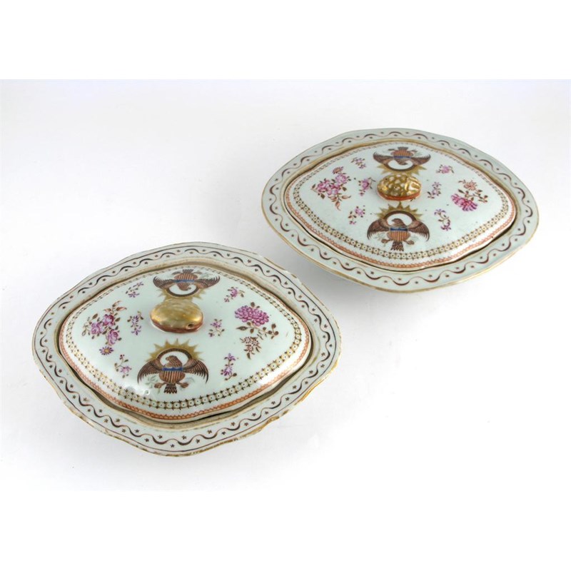 A pair of Chinese famille rose export tureens and covers, painted with the American eagle with outspread wings, holding in his talons the symbolic olive branch and bundle of arrows, early 19th century, one tureen with frits round the edge, both with rubbed gilding, 23.5cm. (4)