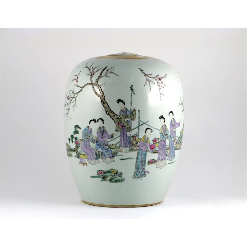 A Chinese ovoid jar and cover, painted with a group of six ladies, the reverse with five rows of calligraphy, the lid with four characters, the base with a stamped seal mark, some rubbing to the gilding, 1st half 20th century, 28cm. (2)