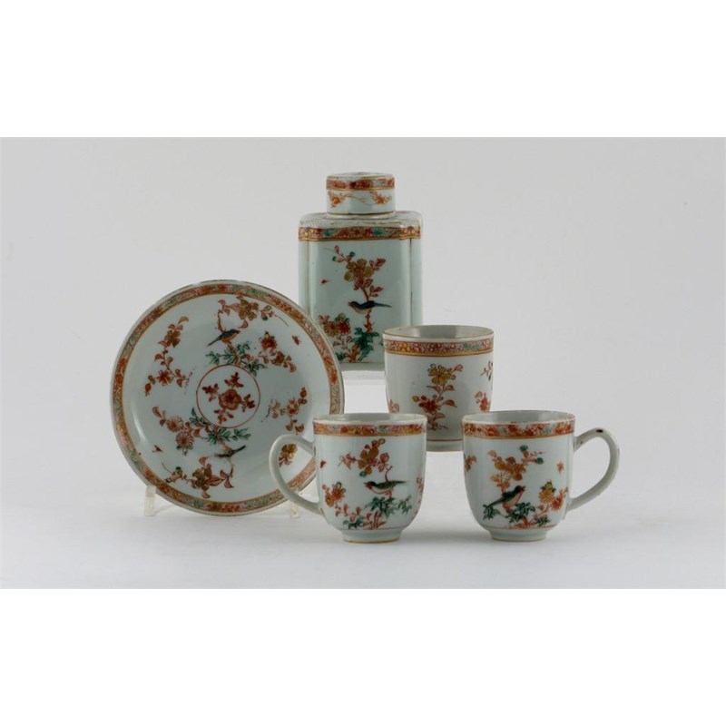 A Chinese famille verte tea canister and cover, six matching coffee cups and a saucer, all painted with green songbirds on flowering leafy branches, early 18th century, small chips and frits, 11cm max. (9)