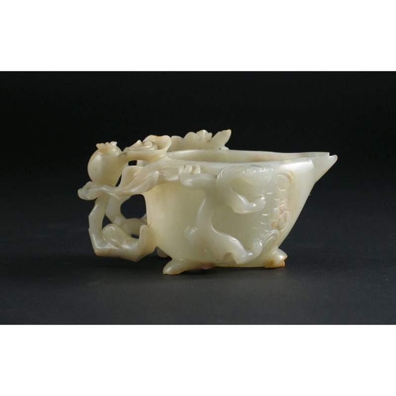 A Chinese white jade brush washer, formed as a pomegranate, the handle formed as open leafy branches, a small fruit and a chilong clinging to the side, the stone with pale beige inclusions, probably 18th century, 11cm.