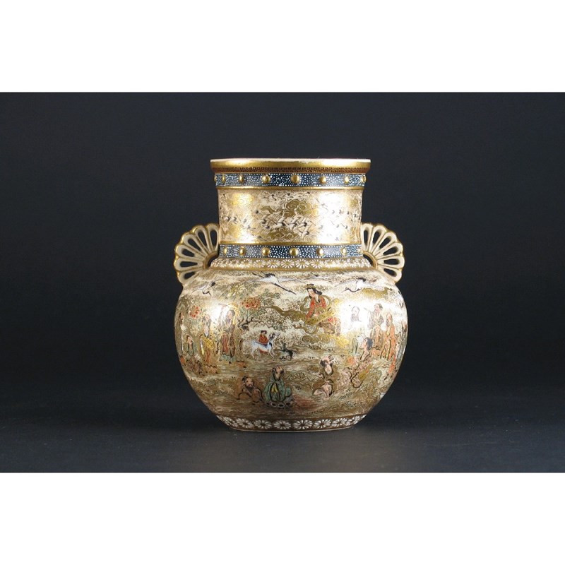 A Japanese Satsuma vase, with chrysanthemum handles, decorated with many figures and animals, with fans and musical instruments beneath a band of migrating cranes, red painted mark, Meiji 1868-1912, 10.8cm.