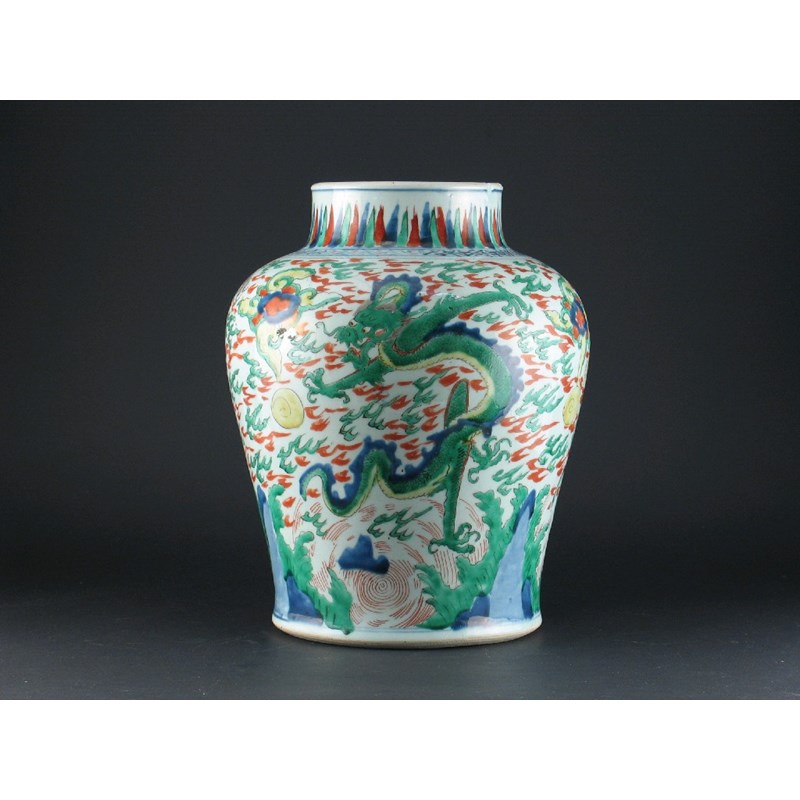 A Chinese w ucai baluster vase, brightly decorated with three dragons amidst stylized clouds in pursuit of pearls. A tiny well restored rim chip. Transitional c.1650, 33cm. High.