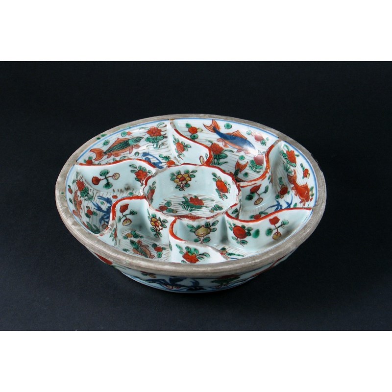 A rare late Ming wucai compartmented dish, decorated with fish, crabs and crustations, swimming amidst lotus and water weed. Some fritting to the edges of the divides, the cover lacking. Six character Wanli mark within a double circle and of the period 1573-1619, 22cm.
