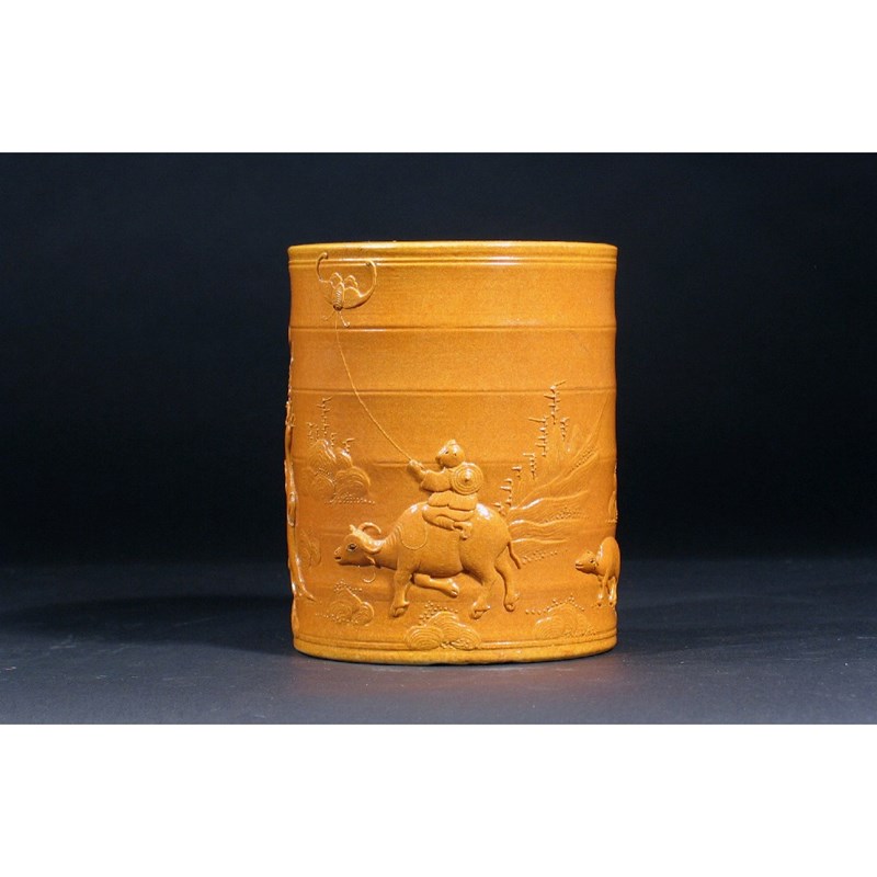 A Chinese yellow glazed brush pot , moulded with a boy flying a kite while riding a buffalo, six character Qianlong mark but later, 14.5cm.