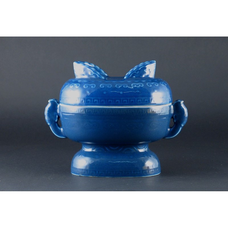 A Chinese blue glazed alter vase and cover, the oval body moulded with key fret and stylized scrolls, each piece with a moulded Jiaqing mark and perhaps of the period, 24cm. Wide. (2)