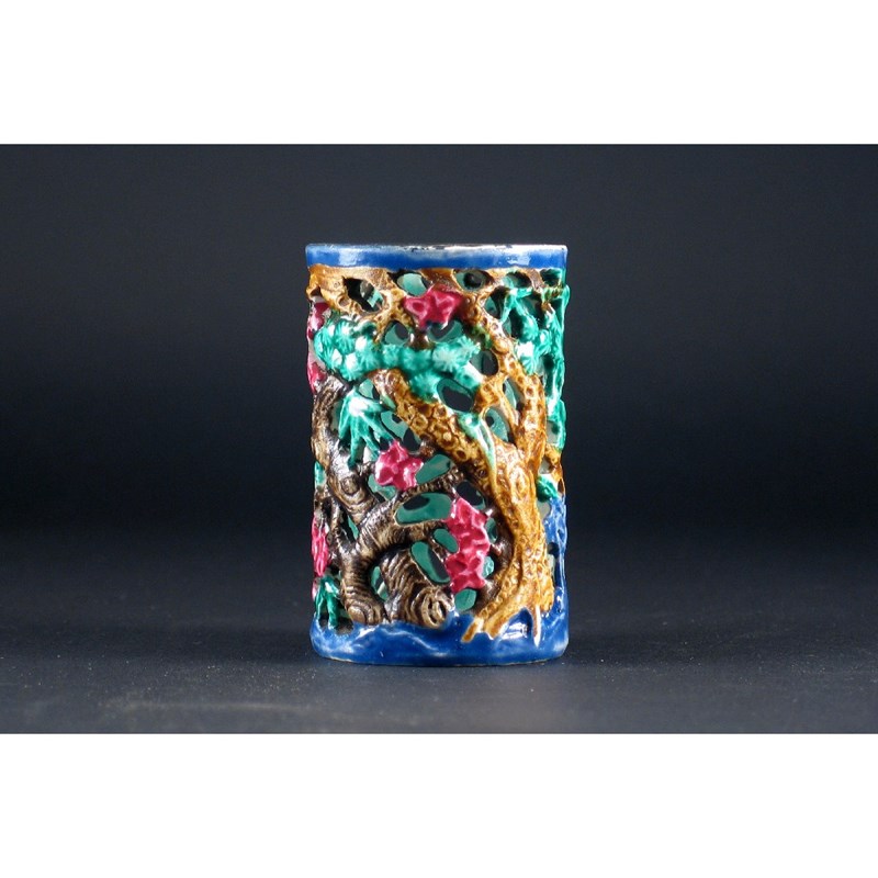 A Chinese reticulated brush pot, carved with pine trees, bamboo and prunus above blue rockwork, Qianlong 1736-95, 9.8cm.