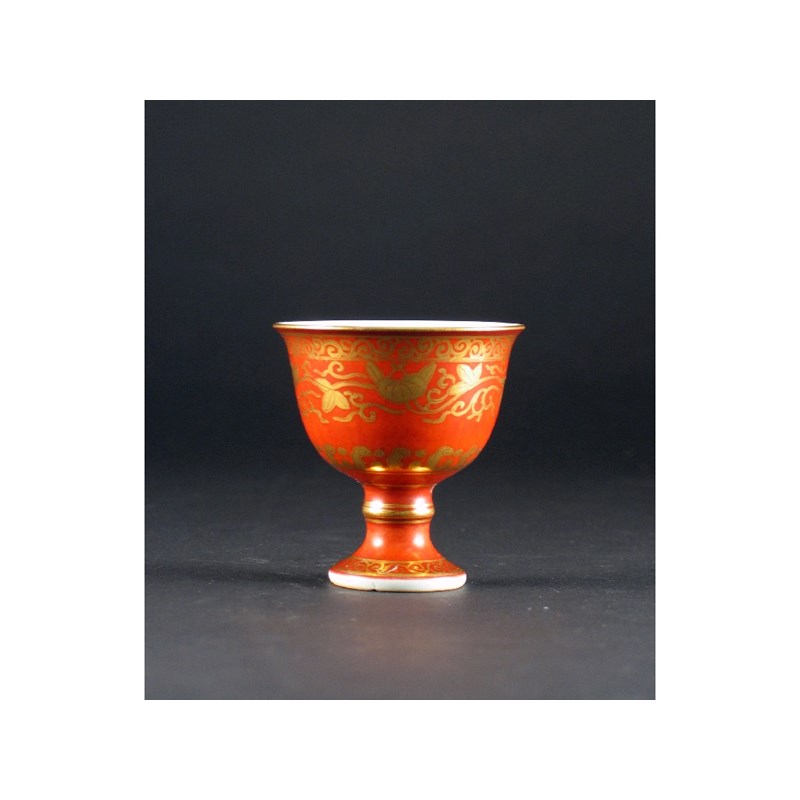 An unusual Japanese kinrande wine cup , by Eiraku Hozen (1795-1854), decorated with gilt leaves and scrolls above breaking waves on an iron-red ground, six character mark, 19th century, 7cm. Contained in a wooden box.