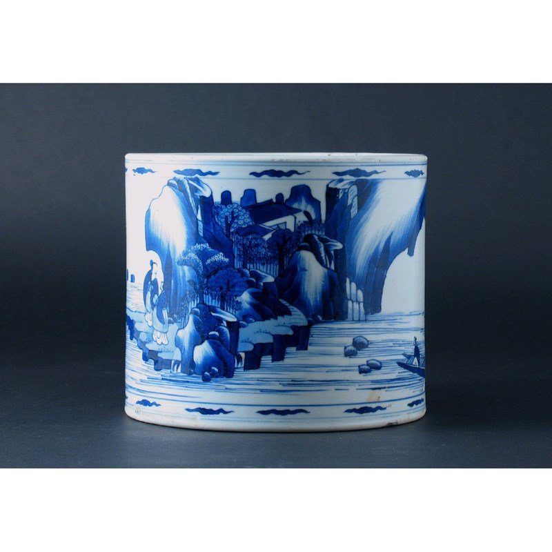 A Chinese blue and white cylindrical brush pot, decorated with a figures in a watery landscape. A hair crack. Kangxi 1662-1722, 17.5cm. Wide.