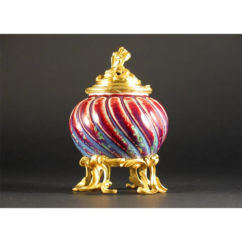 A Chinese flamb glazed spiral moulded vase, ormolu mounted as an inkwell with a hinged lid, 19th century, 15cm.