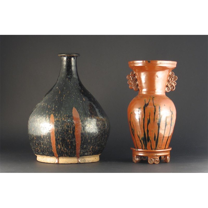 A brown glazed Chinese vase and stand, with moulded scroll handles, a dark streaked glaze and a separate stand with five feet, perhaps 17th century, and a large brown glazed stoneware bottle. Some chipping. 35cm. Max. (3)