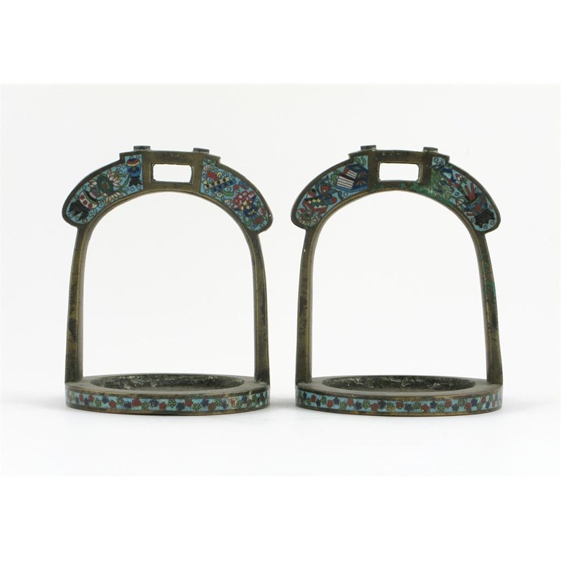 A pair of Chinese cloisonné stirrups, decorated with vases and flowerheads, 16cm high. (2)