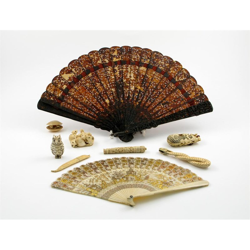 A Japanese ivory carving of seven rats, three character signature, an ivory owl netsuke, a carving of the clams dream, an lacquered inro, a tortoiseshell fan, an ivory fan and five other items, most 19th century, minor damages, 41cm max. (11)