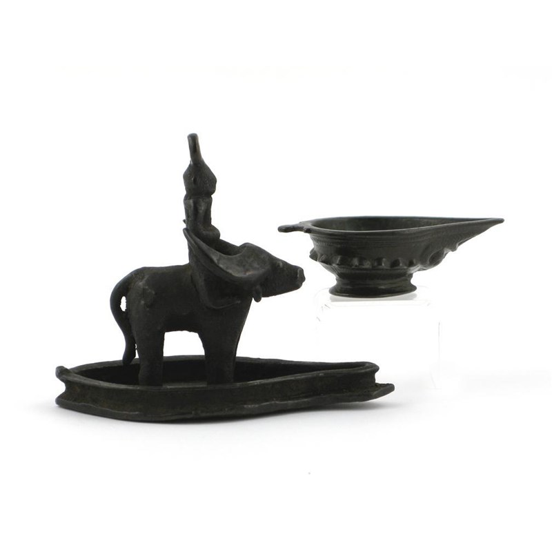 Two bronze Indian oil lamps, one cast as a figure astride a water buffalo, 19th century, 13.5cm. (2)